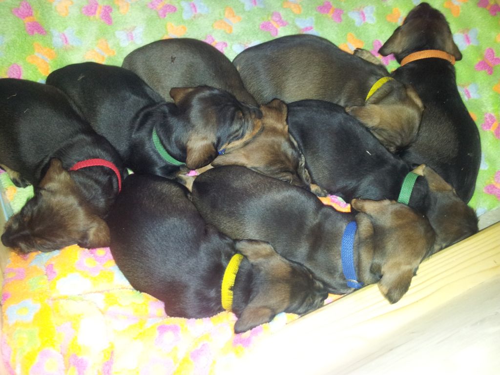 Die Welpen sind da !!!!! Heute (01.06.2013) wurden vier Rüden und vier Hündinnen geboren. Hella ist etwas erschöpft---aber alle sind wohlauf. |